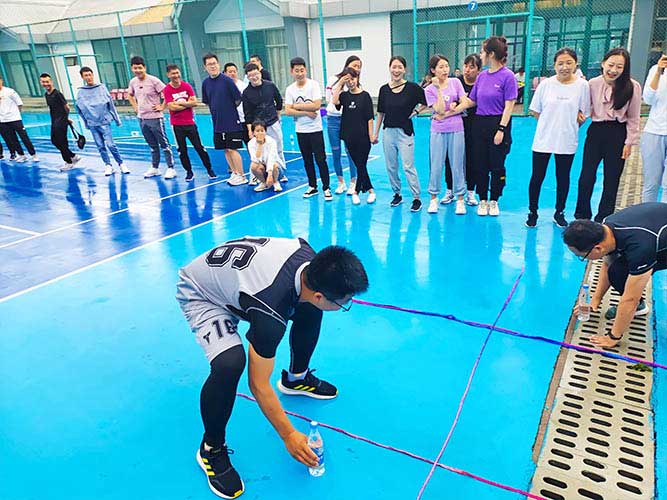 大家一排站好,從左到右,每人的右腿與另一人的左腿依次并齊,并用扁帶繩子系上,繩子綁的位置是腳踝以上部分。聽見哨聲即為游戲開始,從起點到終點,按用時由短到長,取前五名依次加分。